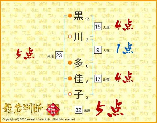黒(12画)川(3画) 多(6画)佳(8画)子(3画)