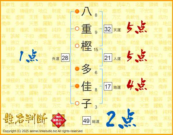 八重樫多佳子さんの総運は49画の2点!