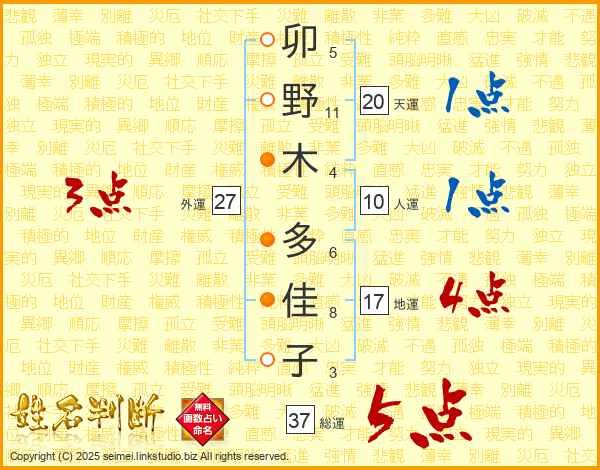 卯(5画)野(11画)木(4画) 多(6画)佳(8画)子(3画)