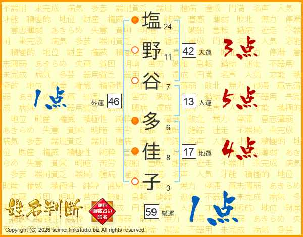 塩(24画)野(11画)谷(7画) 多(6画)佳(8画)子(3画)