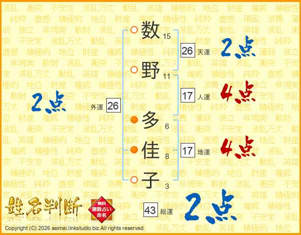 数野多佳子さんの総運は43画の2点!
