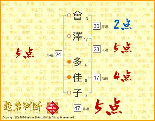 會(13画)澤(17画) 多(6画)佳(8画)子(3画)