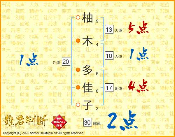 柚木多佳子さんの天運は13画の5点!