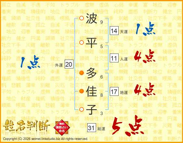 波(9画)平(5画) 多(6画)佳(8画)子(3画)