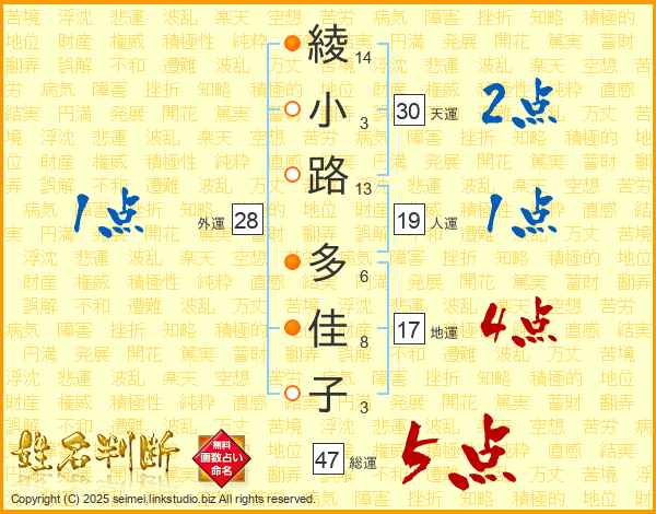 綾(14画)小(3画)路(13画) 多(6画)佳(8画)子(3画)