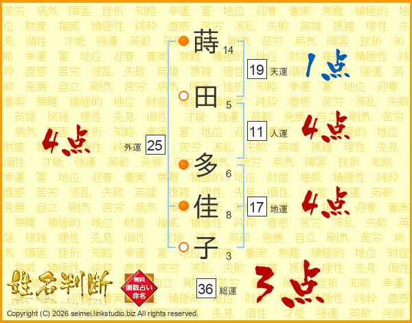 蒔(14画)田(5画) 多(6画)佳(8画)子(3画)