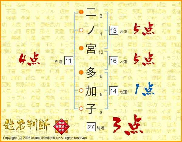 二ノ宮多加子さんの総運は27画の3点!