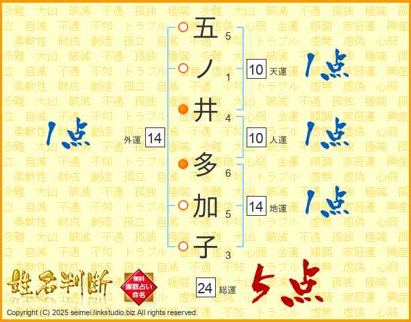 五(5画)ノ(1画)井(4画) 多(6画)加(5画)子(3画)