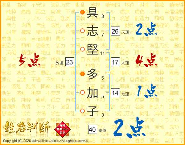 具(8画)志(7画)堅(11画) 多(6画)加(5画)子(3画)