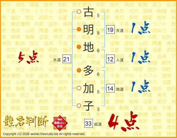 古(5画)明(8画)地(6画) 多(6画)加(5画)子(3画)