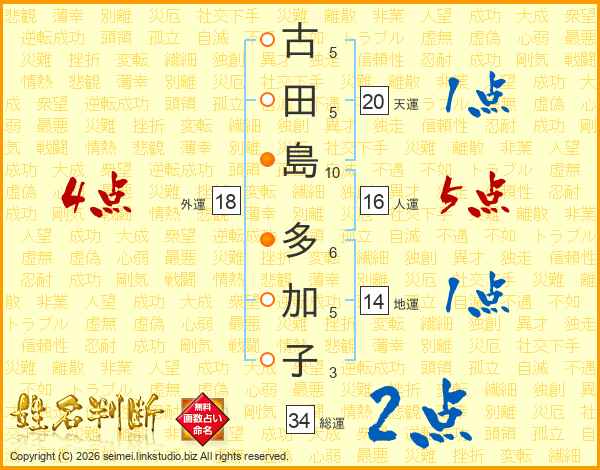 古(5画)田(5画)島(10画) 多(6画)加(5画)子(3画)
