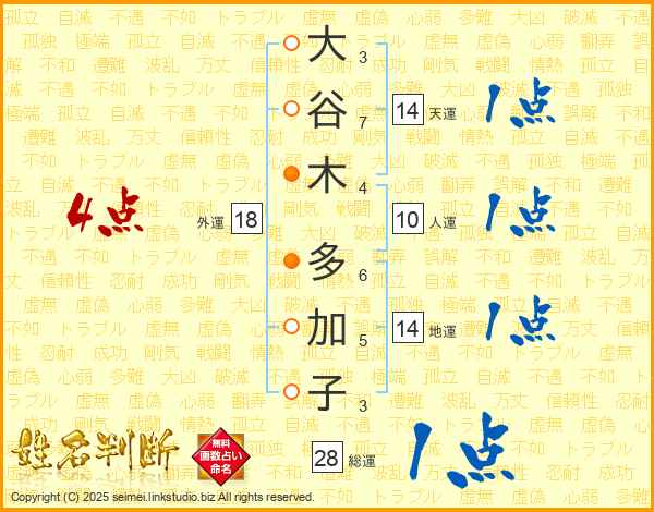 大(3画)谷(7画)木(4画) 多(6画)加(5画)子(3画)