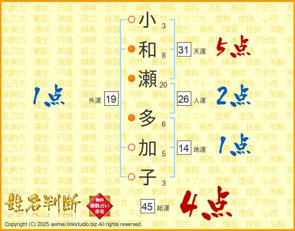 小和瀬多加子さんの総運は45画の4点!