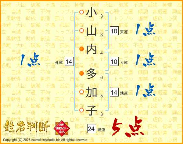 小山内多加子さんの総運は24画の5点!