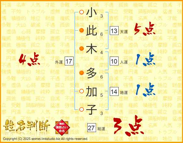 小(3画)此(6画)木(4画) 多(6画)加(5画)子(3画)