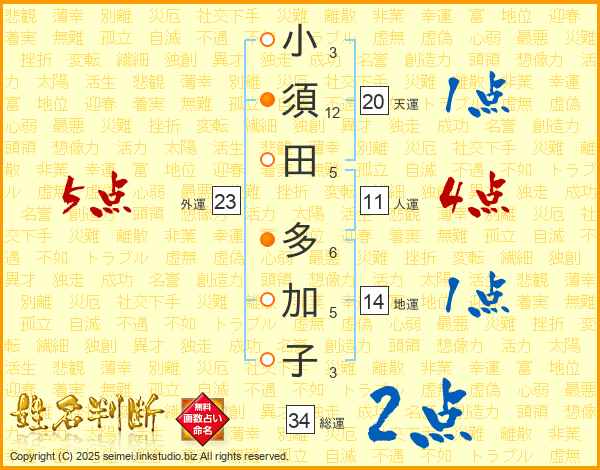 小(3画)須(12画)田(5画) 多(6画)加(5画)子(3画)
