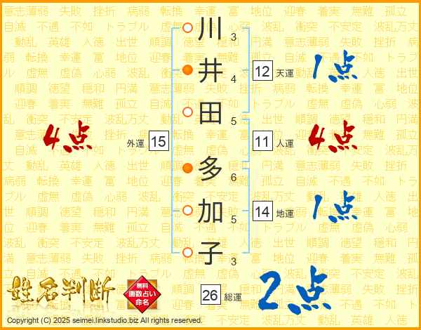 生活面を象徴する運勢です。外部から受ける影響力を表し、結婚運、家庭運や職場、環境への順応性を表します。総運から人運を引いた画数。姓や名が1文字の場合を除く。