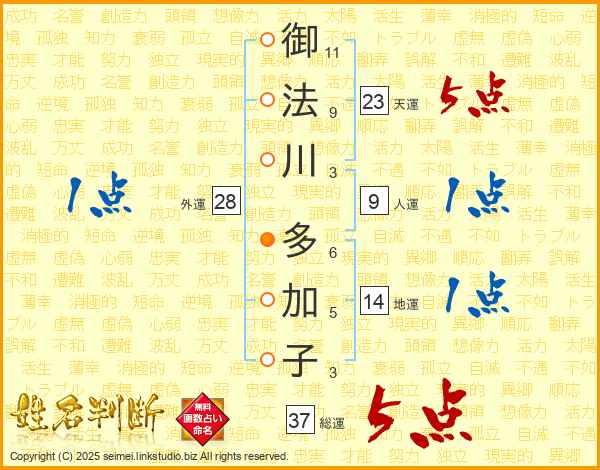 御(11画)法(9画)川(3画) 多(6画)加(5画)子(3画)