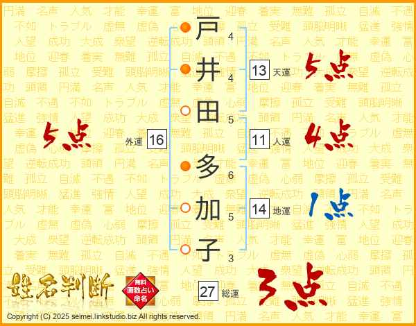 戸(4画)井(4画)田(5画) 多(6画)加(5画)子(3画)