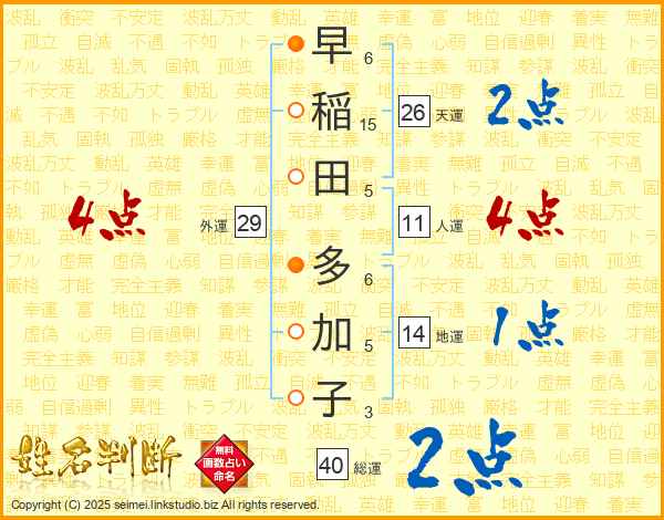 早稲田多加子さんの総運は40画の2点!