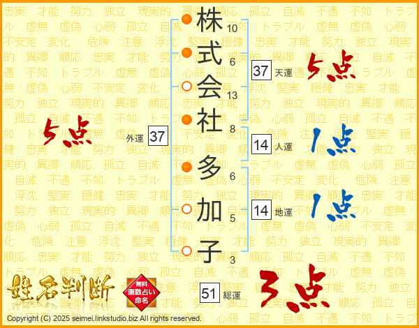 株(10画)式(6画)会(13画)社(8画) 多(6画)加(5画)子(3画)