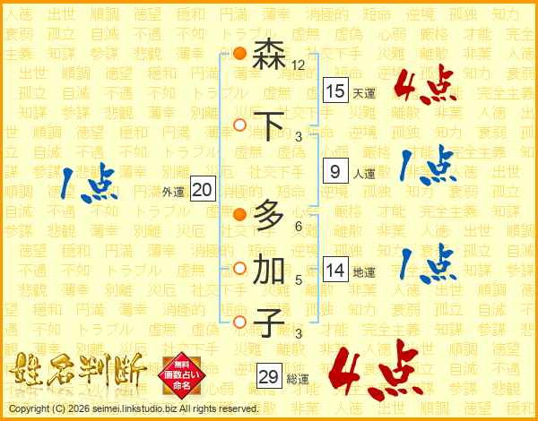 森下多加子さんの総運は29画の4点!