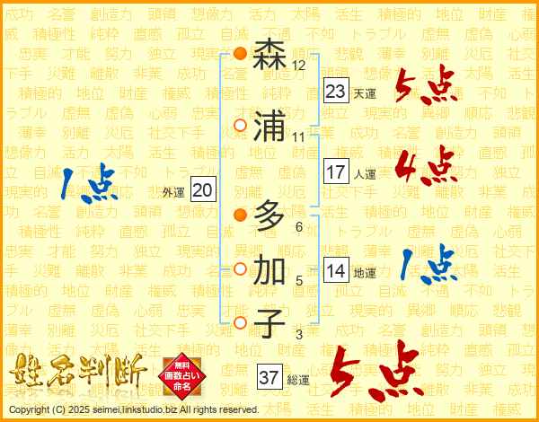 森(12画)浦(11画) 多(6画)加(5画)子(3画)