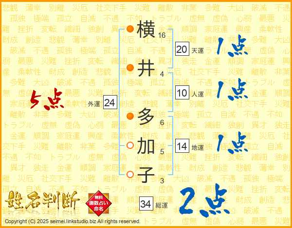 横(16画)井(4画) 多(6画)加(5画)子(3画)