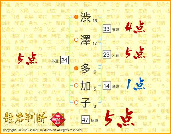 渋(16画)澤(17画) 多(6画)加(5画)子(3画)