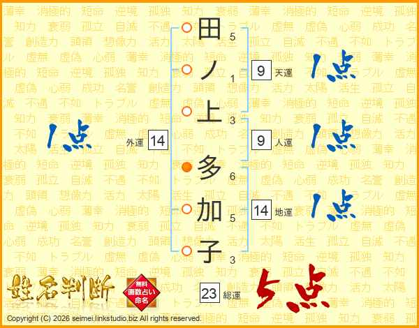 田(5画)ノ(1画)上(3画) 多(6画)加(5画)子(3画)