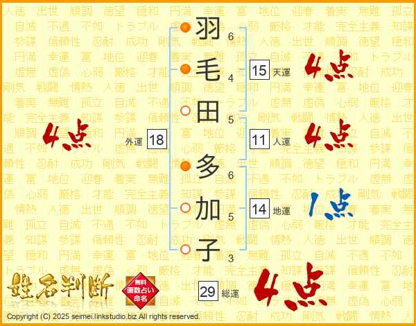 羽毛田多加子さんの総運は29画の4点!