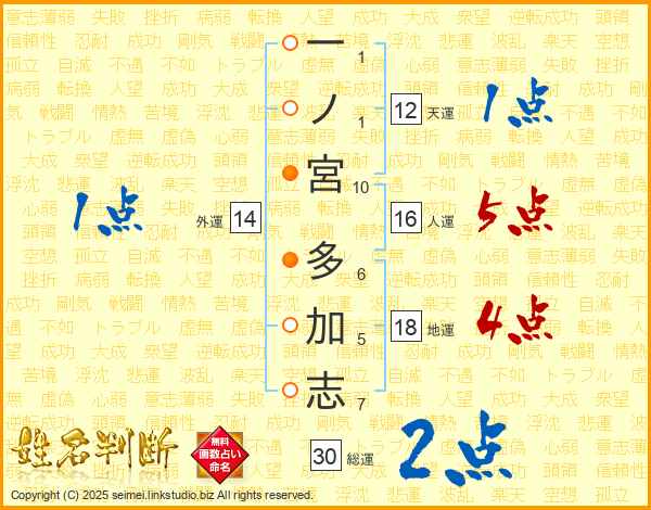 あなたの人生を表す1番重要な運勢です。生涯を通じて影響する総合運となり、主に50歳以降の晩年期に影響を及ぼします。苗字と名前の合計画数。