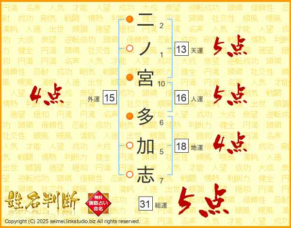 生活面を象徴する運勢です。外部から受ける影響力を表し、結婚運、家庭運や職場、環境への順応性を表します。総運から人運を引いた画数。姓や名が1文字の場合を除く。