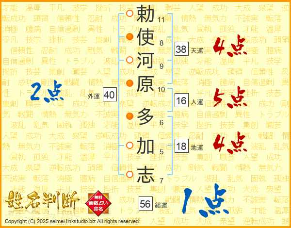 勅(11画)使(8画)河(9画)原(10画) 多(6画)加(5画)志(7画)