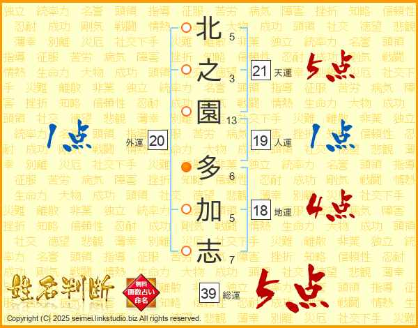北(5画)之(3画)園(13画) 多(6画)加(5画)志(7画)