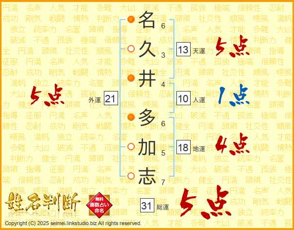 名(6画)久(3画)井(4画) 多(6画)加(5画)志(7画)