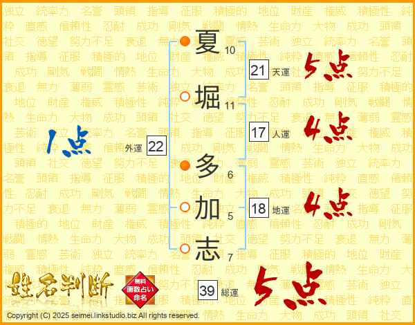 夏(10画)堀(11画) 多(6画)加(5画)志(7画)
