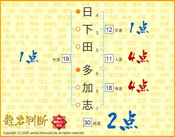 日(4画)下(3画)田(5画) 多(6画)加(5画)志(7画)