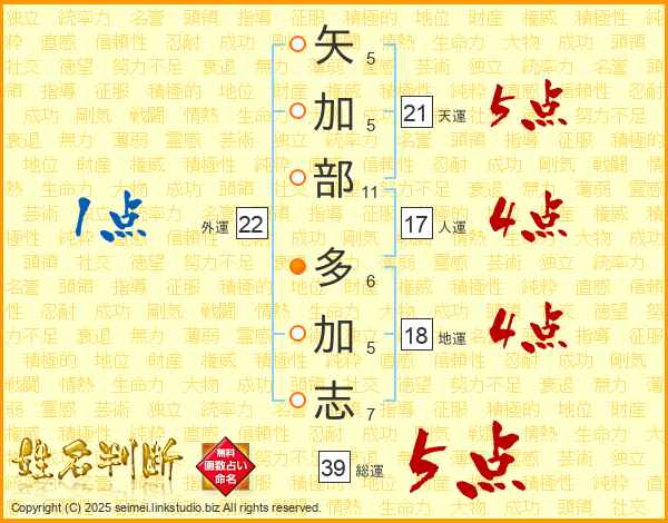矢(5画)加(5画)部(11画) 多(6画)加(5画)志(7画)