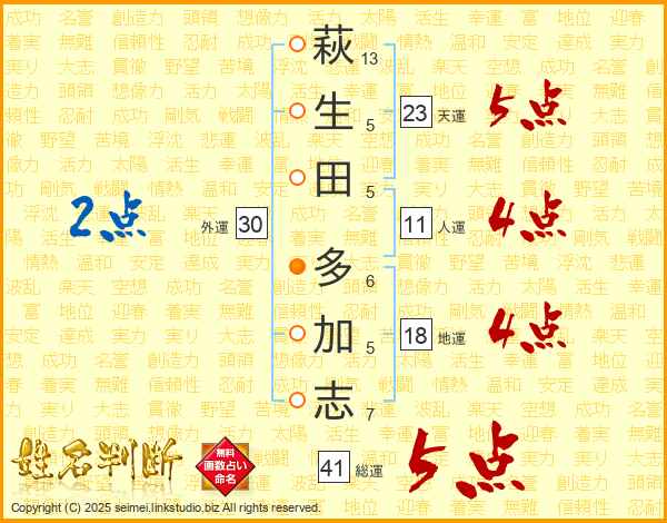 萩(13画)生(5画)田(5画) 多(6画)加(5画)志(7画)