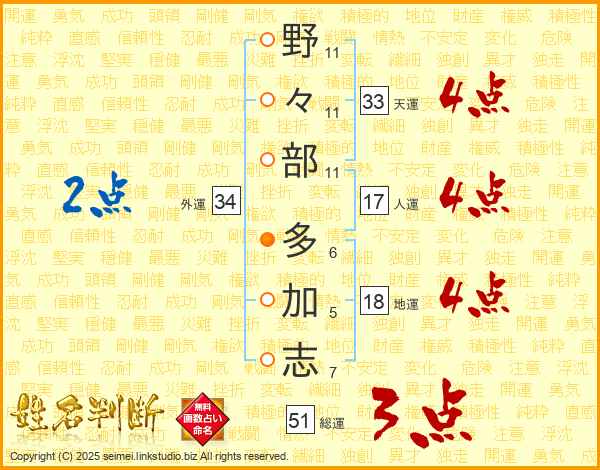 野(11画)々(11画)部(11画) 多(6画)加(5画)志(7画)