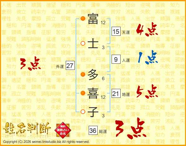 富(12画)士(3画) 多(6画)喜(12画)子(3画)