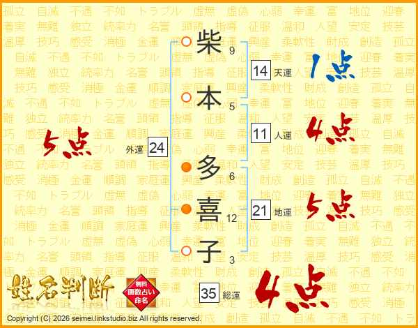 柴(9画)本(5画) 多(6画)喜(12画)子(3画)