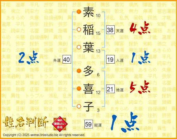 素(10画)稲(15画)葉(13画) 多(6画)喜(12画)子(3画)