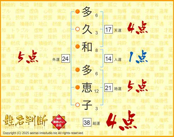 多(6画)久(3画)和(8画) 多(6画)恵(12画)子(3画)