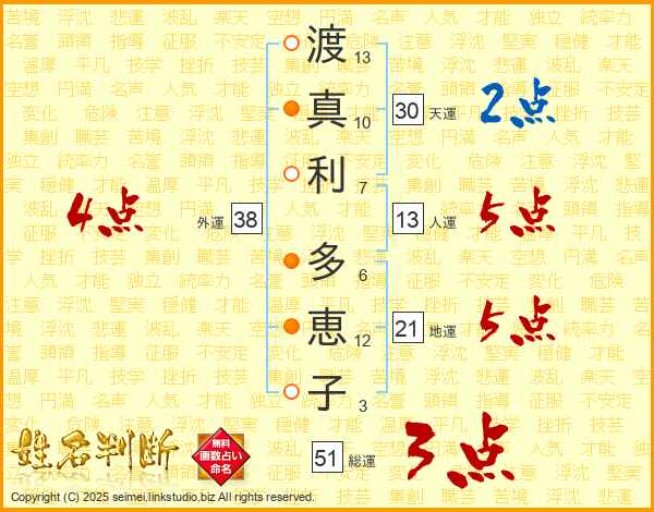 渡(13画)真(10画)利(7画) 多(6画)恵(12画)子(3画)