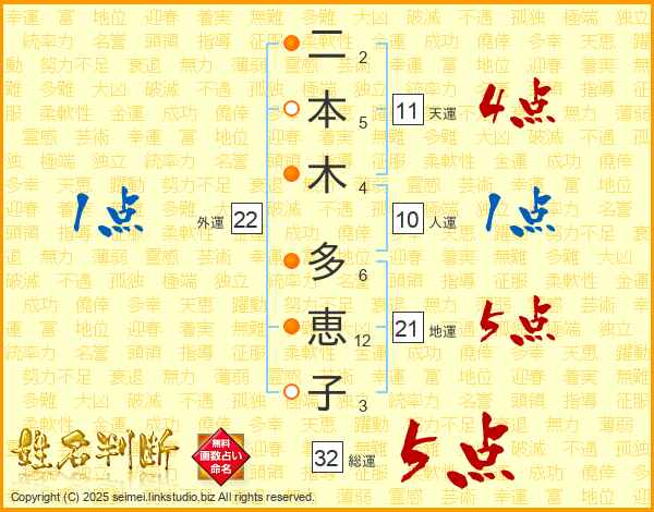 二(2画)本(5画)木(4画) 多(6画)恵(12画)子(3画)