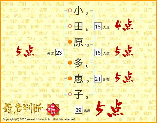 生活面を象徴する運勢です。外部から受ける影響力を表し、結婚運、家庭運や職場、環境への順応性を表します。総運から人運を引いた画数。姓や名が1文字の場合を除く。