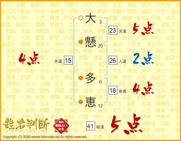 家系が持つ宿命的な運勢を表します。祖先から受け継いだ苗字ですので自分の力が及びません。家柄を象徴します。苗字の合計画数。