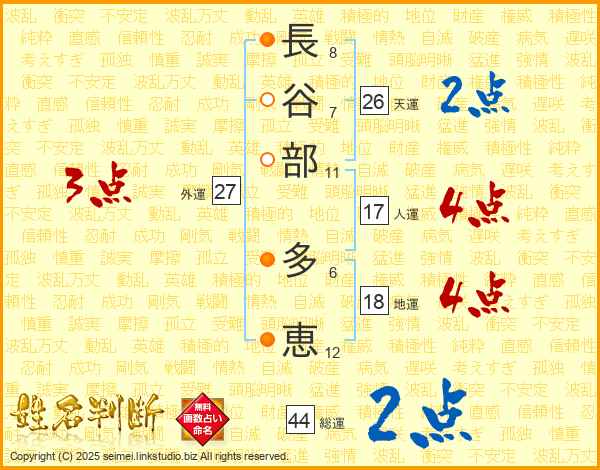 長(8画)谷(7画)部(11画) 多(6画)恵(12画)